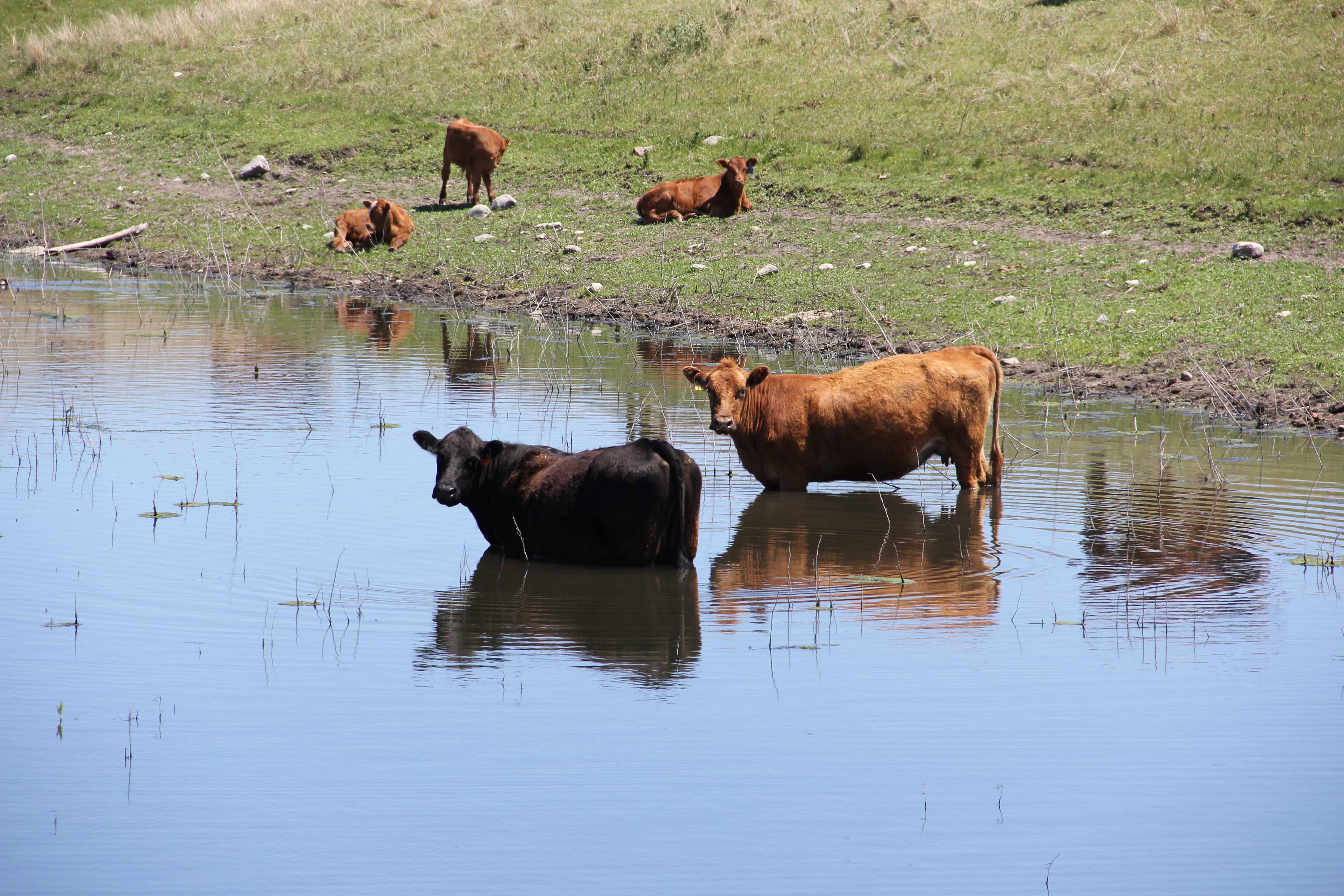 cows cooling off in pond other cows relaxing on shore