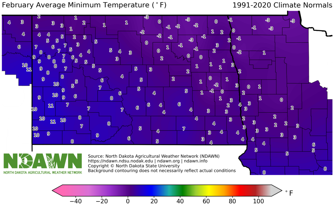 February Average Minimum Temperature (°F) 1991-2020. Source: North Dakota Agricultural Weather Network (NDAWN). © Copyright North Dakota State University. Background contouring does not necessarily reflect actual conditions.