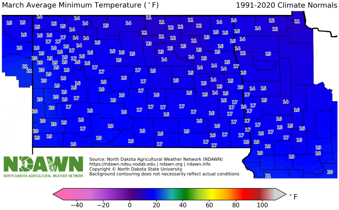 March Average Minimum Temperature (°F) 1991-2020. Source: North Dakota Agricultural Weather Network (NDAWN). © Copyright North Dakota State University. Background contouring does not necessarily reflect actual conditions.