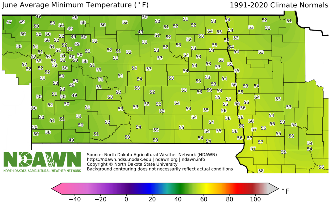 June Average Minimum Temperature (°F) 1991-2020. Source: North Dakota Agricultural Weather Network (NDAWN). © Copyright North Dakota State University. Background contouring does not necessarily reflect actual conditions.