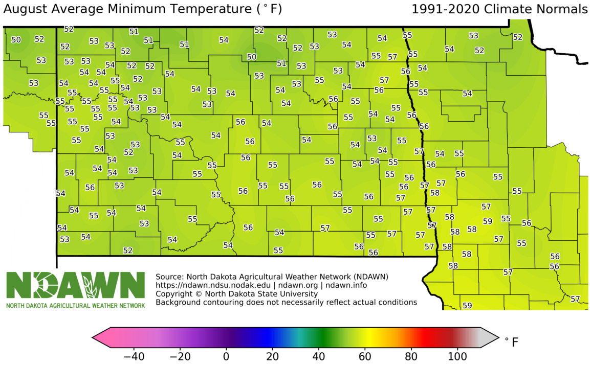 August Average Minimum Temperature (°F) 1991-2020. Source: North Dakota Agricultural Weather Network (NDAWN). © Copyright North Dakota State University. Background contouring does not necessarily reflect actual conditions.