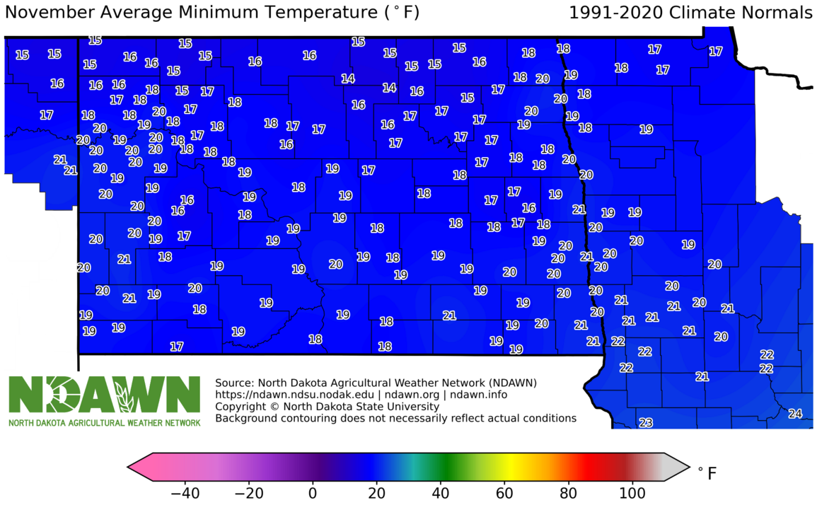 November Average Minimum Temperature (°F) 1991-2020. Source: North Dakota Agricultural Weather Network (NDAWN). © Copyright North Dakota State University. Background contouring does not necessarily reflect actual conditions.