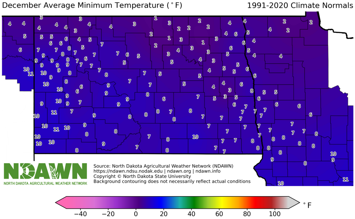 December Average Minimum Temperature (°F) 1991-2020. Source: North Dakota Agricultural Weather Network (NDAWN). © Copyright North Dakota State University. Background contouring does not necessarily reflect actual conditions.