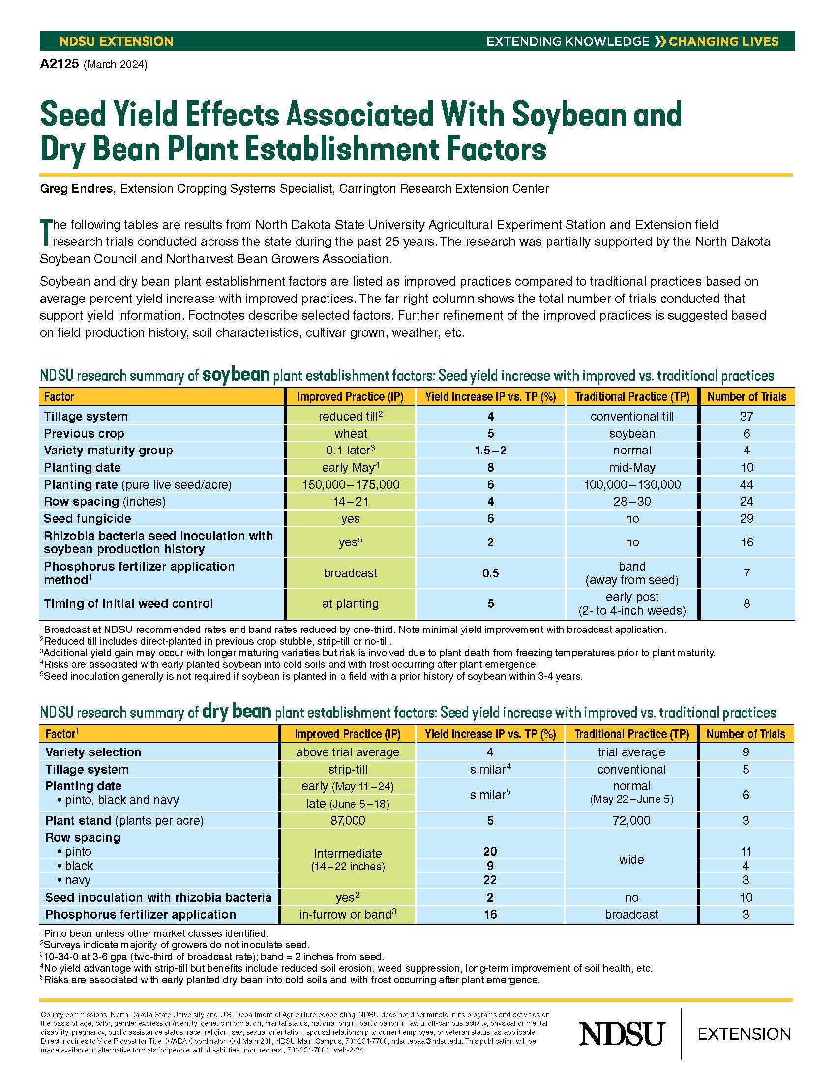 The publication provides tables that list 10 soybean and 7 dry bean plant establishment factors indicating seed yield increases with improved production practices compared to traditional practices. The data is based on results from North Dakota State University Agricultural Experiment Station and Extension field research trials conducted across the state during the past 25 years.
