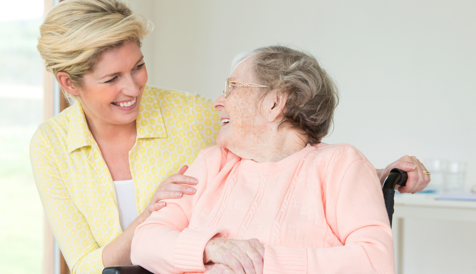 woman smiling at mom in sitting in a wheelchair