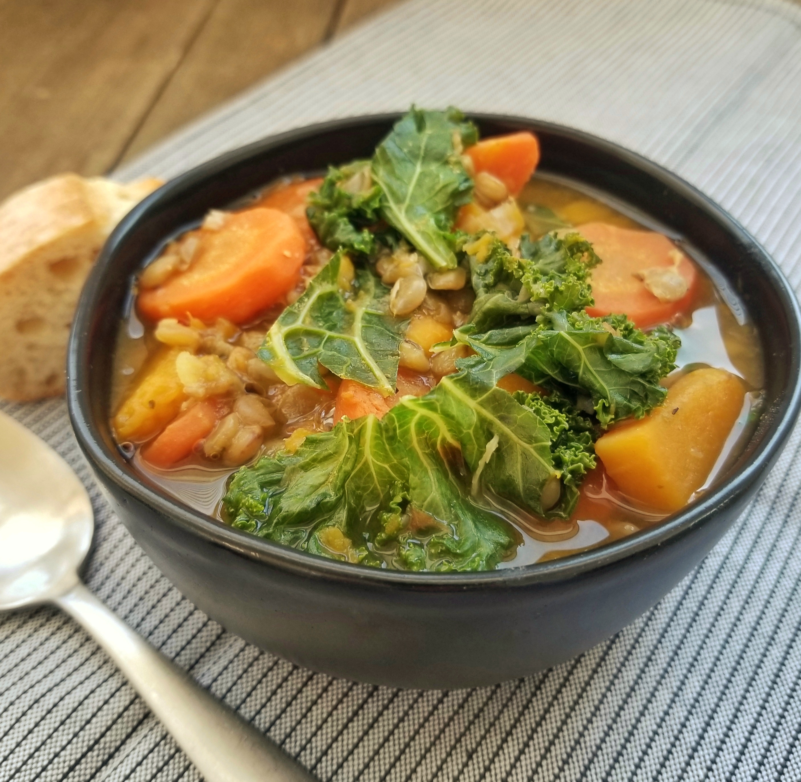 Add the squash, vegetable broth, lentils, thyme, oregano, and kosher salt, and bring to a boil. Reduce heat and simmer for about 20 minutes until the lentils and butternut squash are soft (taste test a few). In the last few minutes, add the chopped kale and simmer until tender. Add additional salt and pepper to taste. If desired, stir in the lemon juice.