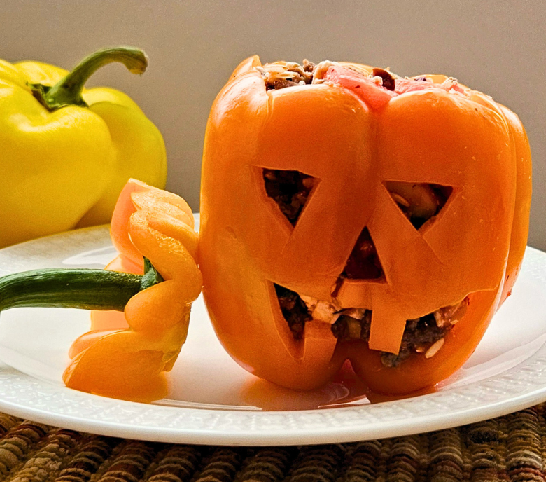 These stuffed peppers can be made festive (like the Jack-o'-lantern pictured) or enjoyed with extra decoration.
