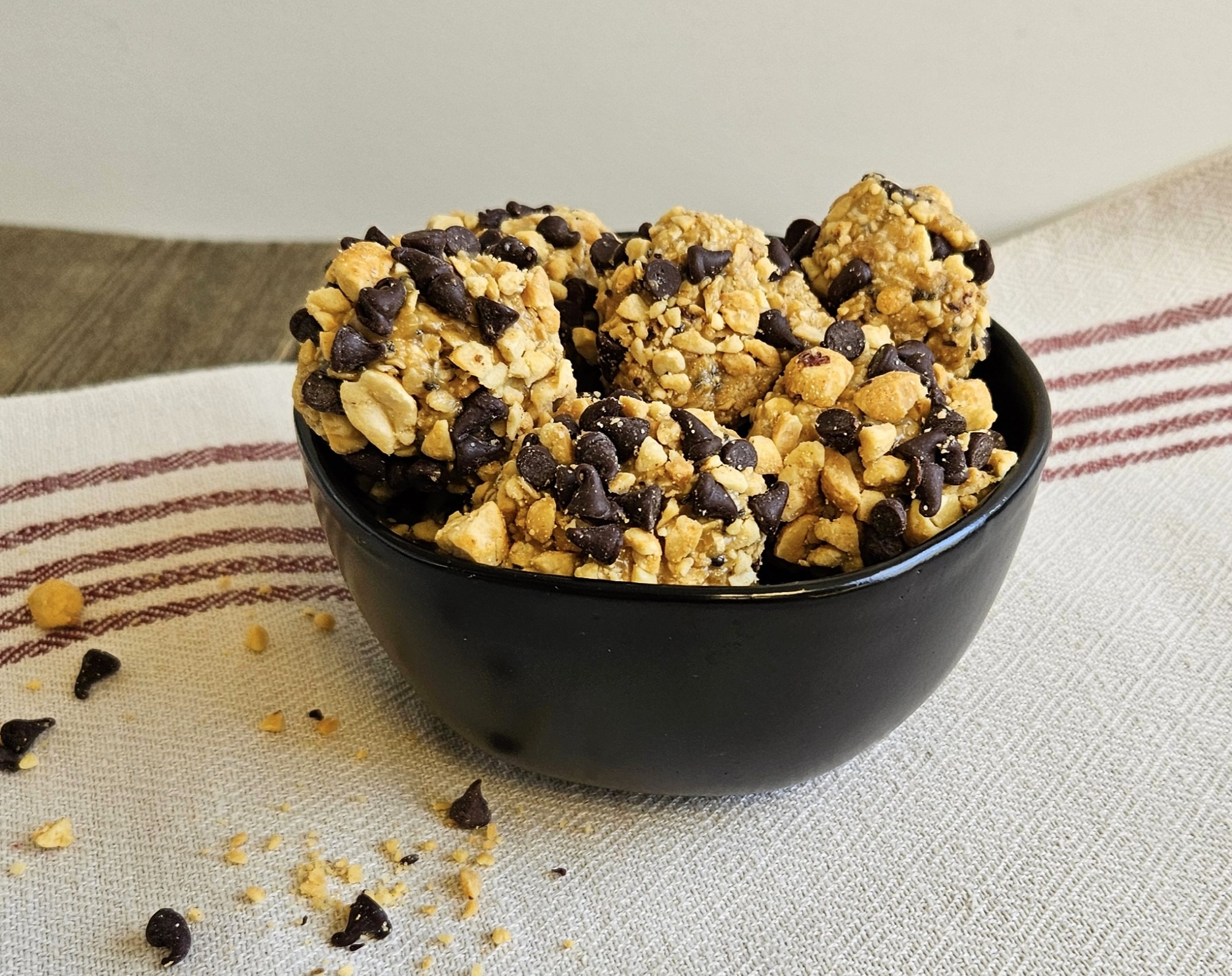 Combine chopped peanuts and mini chocolate chips in a shallow bowl or plate. Roll each ball in the mixture to coat the outside.
