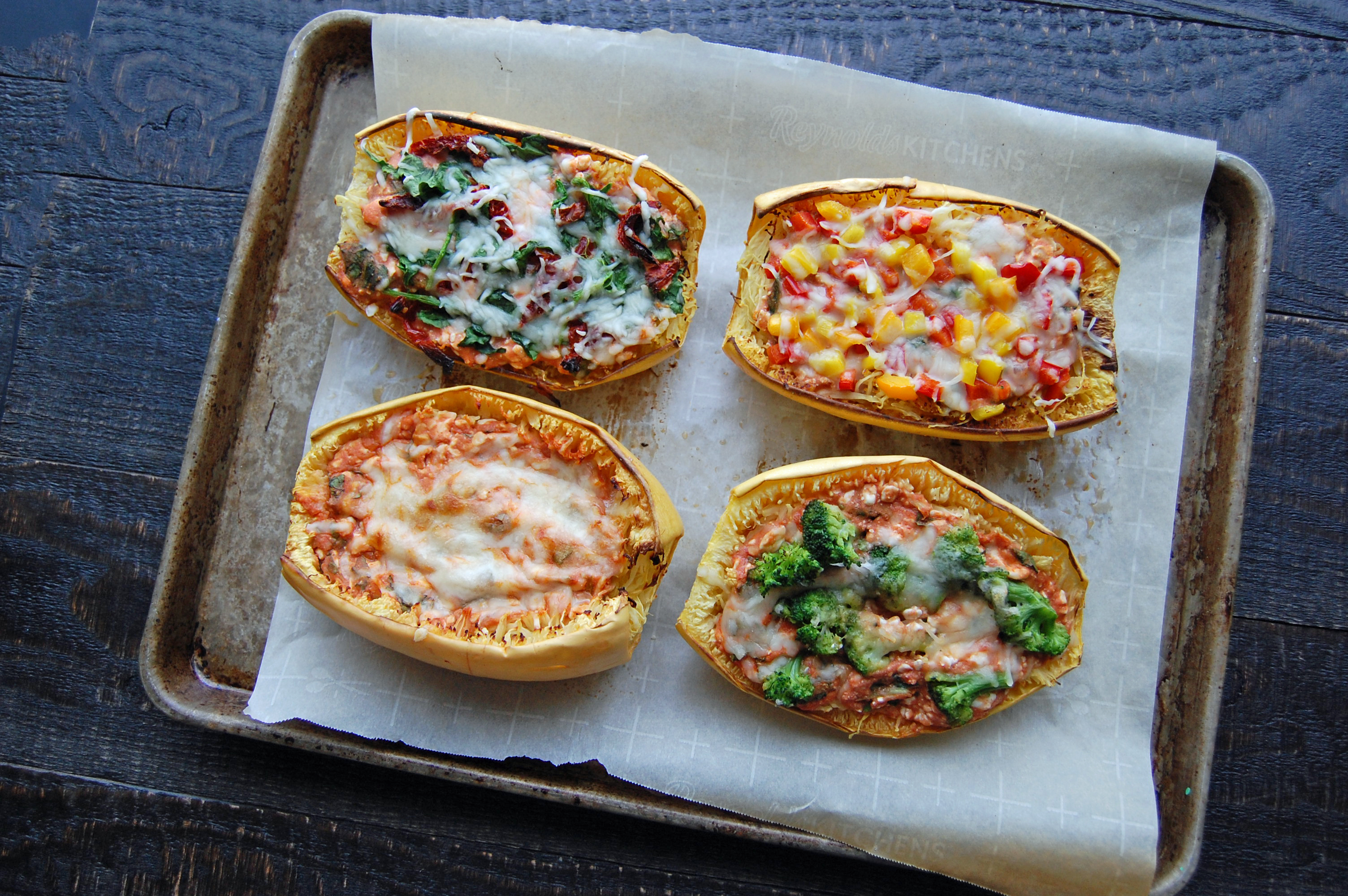 In a medium bowl, combine cottage cheese, parmesan, ¼ cup mozzarella, marinara and spinach. Use fork to scrape and separate the squash strands. Divide filling mixture among the 2 squash halves. Top with your favorite vegetable and sprinkle with mozzarella. Broil until cheese is golden-brown. Approximately 2-3 minutes.