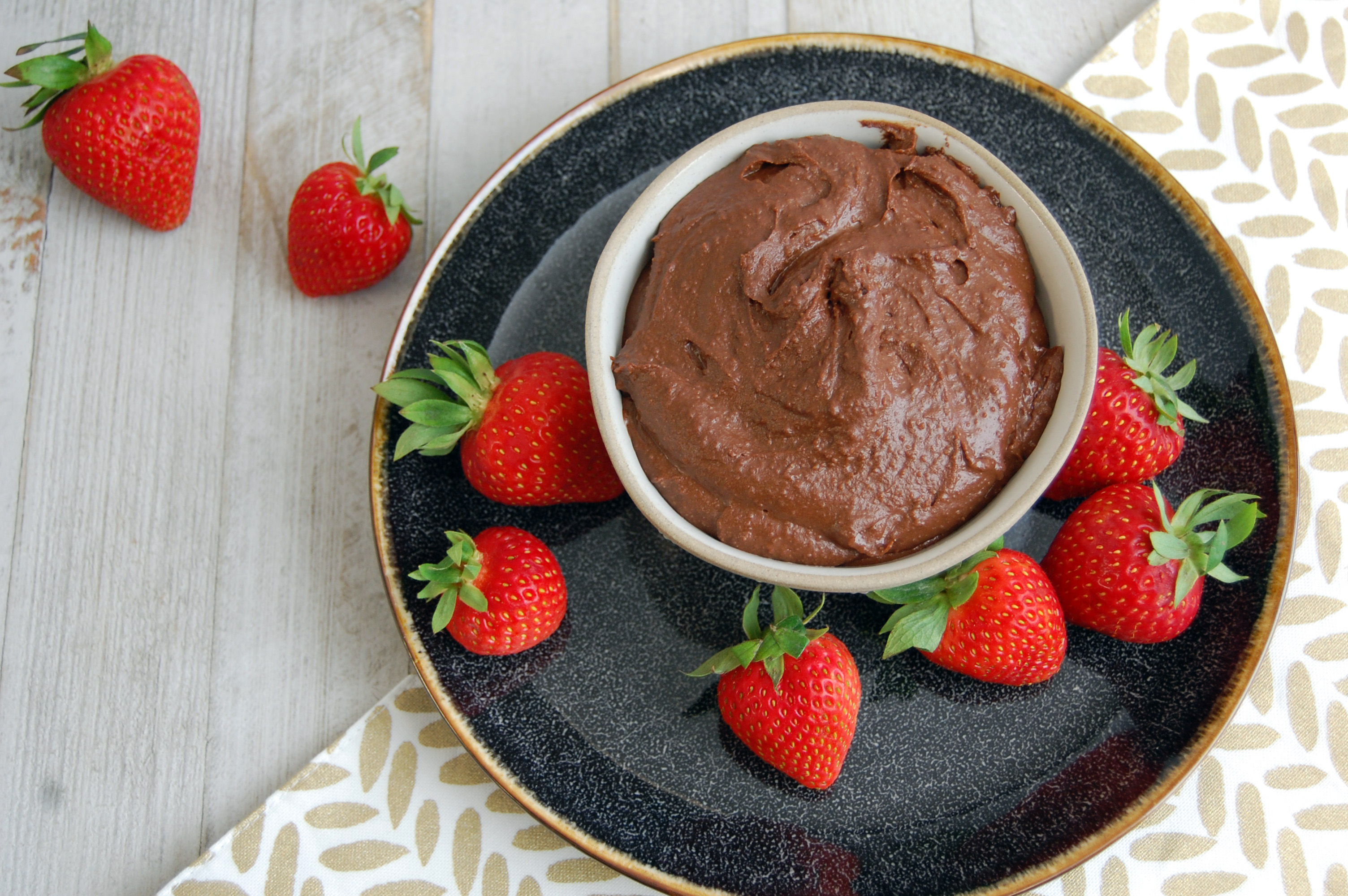 Chocolate Dessert Hummus, served in a dish with strawberries nearby