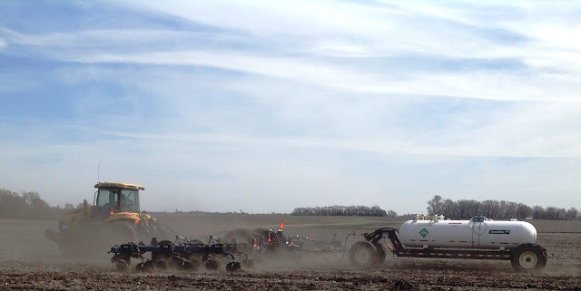 Tractor pulling an anhydrous applicator in a field