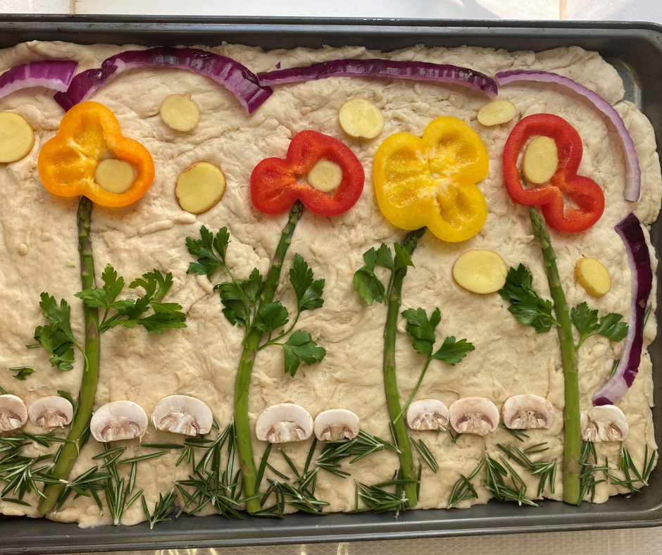 Second dough rise + decoration. Once dough rises for the first time, punch down and then put your dough onto an olive oil-greased standard baking sheet (13- by 9-inch) and press the dough down so it covers the baking sheet and is about ½ inch tall. Preheat oven to 400 F. Now start decorating your blank canvas focaccia, imagining your favorite garden. Create shapes using the vegetables that mimic flowers. Try using peppers as flower heads, asparagus as stems, parsley as leaves and rosemary as grass. Remember that the dough grows and the veggies shrink, so for bright and best results, cover the dough completely with various vegetable flowers. Sprinkle either coarse or fine sea salt over the top of the dough before placing in the oven.
