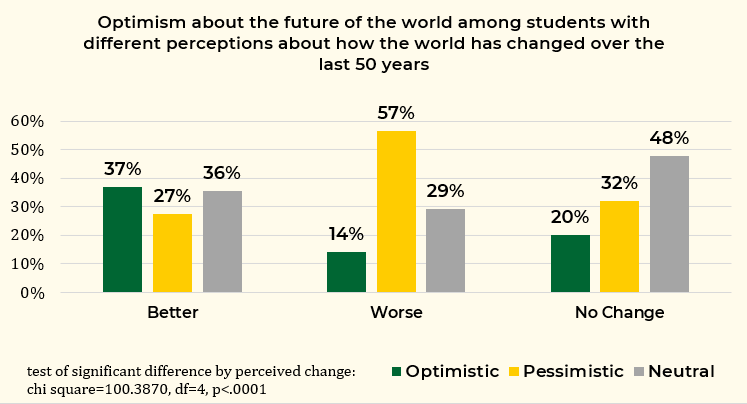 Figure 1 shows the relationship between student optimism about the future of the world and knowledge of human progress. As the figure shows, 37 percent of students who think the world has gotten better over the last 50 years are optimistic about the future of the world, compared to 14 percent of students who think the world has gotten worse and 20 percent of students who think the world has not changed.