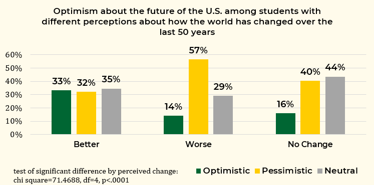 Just as students with more knowledge of progress over the last 50 years are more optimistic about the future of the world, they are also more optimistic about the future of the U.S. Figure 2 shows 33 percent of students who think the world has gotten better over the last 50 years are optimistic about the future of the U.S., compared to 14 percent of students who think the world has gotten worse and 16 percent of students who think the world has not changed.