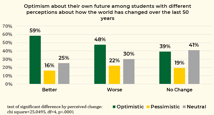 Figure 3 highlights the relationship between knowledge of human progress and students’ optimism about their own futures. As the figure shows, students who have an accurate view of human progress are more likely to be optimistic about their own future. Fifty-nine percent of students who believe the world has gotten better over the last 50 years are optimistic about their own future, compared to 48 percent of students who think the world has gotten worse and 39 percent of students who believe the world has not changed.