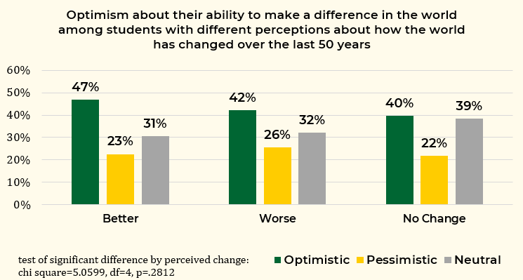 In answering this question, only 49 percent of students responding to the survey said the world has gotten better over the last 50 years, while 35 percent said it has gotten worse, and another 16 percent said it has not changed.