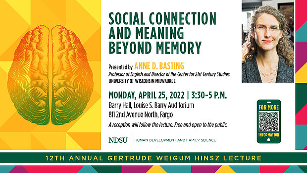 “We are excited to bring Dr. Basting to Fargo to share her work with the campus and community, said Joel Hektner, professor and department head of human development and family science. “Her work spans multiple disciplines, and it exemplifies our mission in HDFS of finding ways to promote well-being at every stage of the lifespan.”