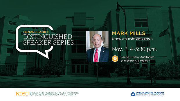 “Mark Mills is addressing many issues important to North Dakota and the world—science, technology, energy and supply chains. At a time when people are anxious about the future, I encourage everyone to come hear why he believes we are on the verge of an economic boom,” said John Bitzan, Menard Family Director of the Challey Institute.