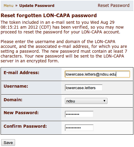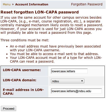 ***ATTENTION*** THE PROCEDURE FOR FIRST LOG-ON IS DETAILED BELOW. PLEASE READ THESE INSTRUCTIONS CAREFULLY. In order to log in the first time, please point your browser to the LON-CAPA index page to find out which server you log into. Then, use the "Forgot password?" dialog, entering the proper information into the blank fields: Your 线上赌博app e-mail id (without the @ndsu.edu portion) and your 线上赌博app e-mail address (with the @ndsu.edu portion); do not use @my.ndsu.edu. The log-in name and e-mail address are case sensitive, and must be lower case.