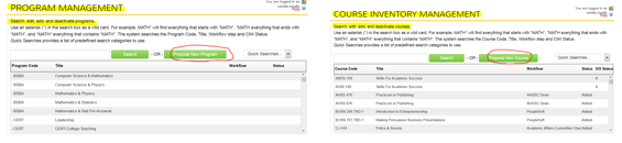 The COURSE INVENTORY MANAGEMENT or PROGRAM MANAGEMENT screen will load. Use the search criteria instructions on the page to access existing courses or programs, click the program when located and begin editing by clicking the green Edit Program button. For a new program or course, click the green Propose New Program or Propose New Course button. |