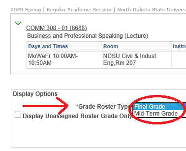 - Make sure ‘Final Grade’ Roster type appears in the drop-down field (unless entering mid-term grades).